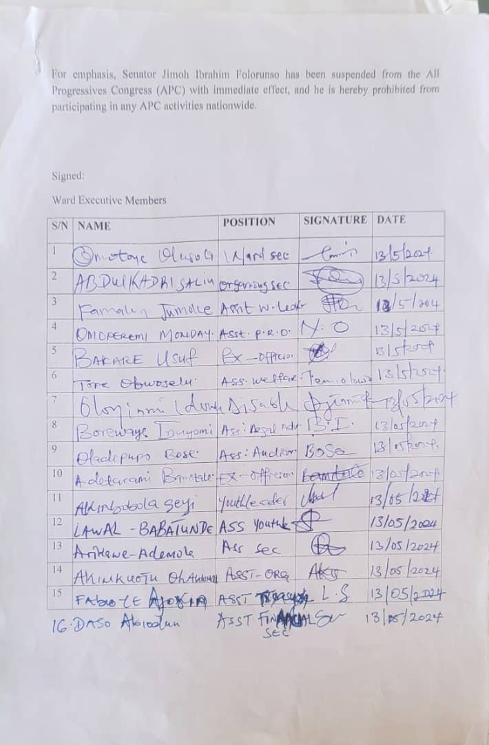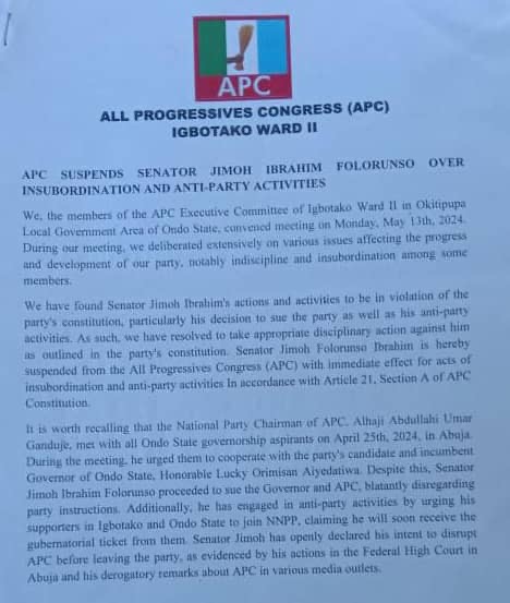 Senator Jimoh Folorunso Ibrahim is hereby suspended from the All Progressives Congress (APC) with immediate effect for acts of insubordination and anti-party activities In accordance with Article 21, Section A of APC Constitution.