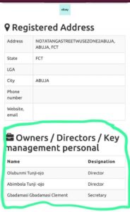 However, a fact check conducted by Starnews NG on the Corporate Affairs Commission’s portal, on Monday evening, revealed that the Minister of Interior, Olubunmi Tunji -Ojo is still a director of the said company. A screenshot of this confirmation is hereby attached to this story.