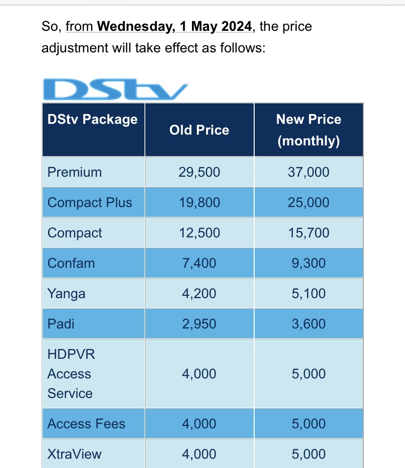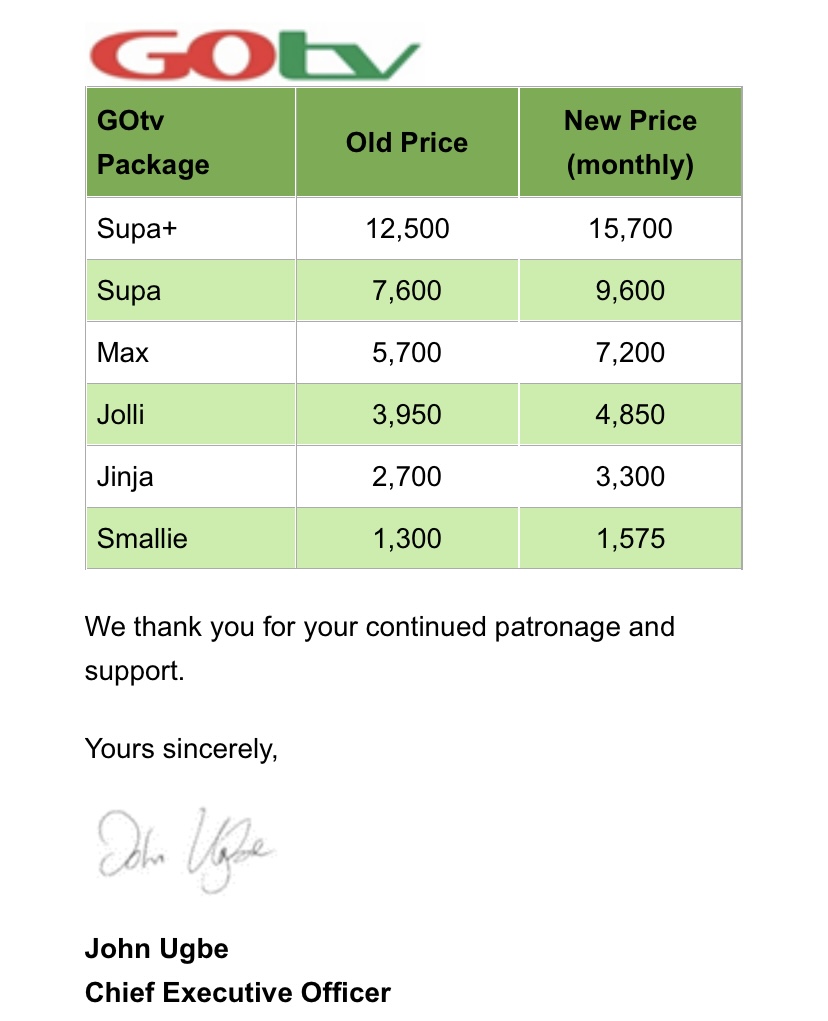 The new price list was contained in a mail forwarded to DSTV and GOTV subscribers, signed by John Ugbe, MultiChoice Chief Executive Officer, on Wednesday 24th April, 2024.