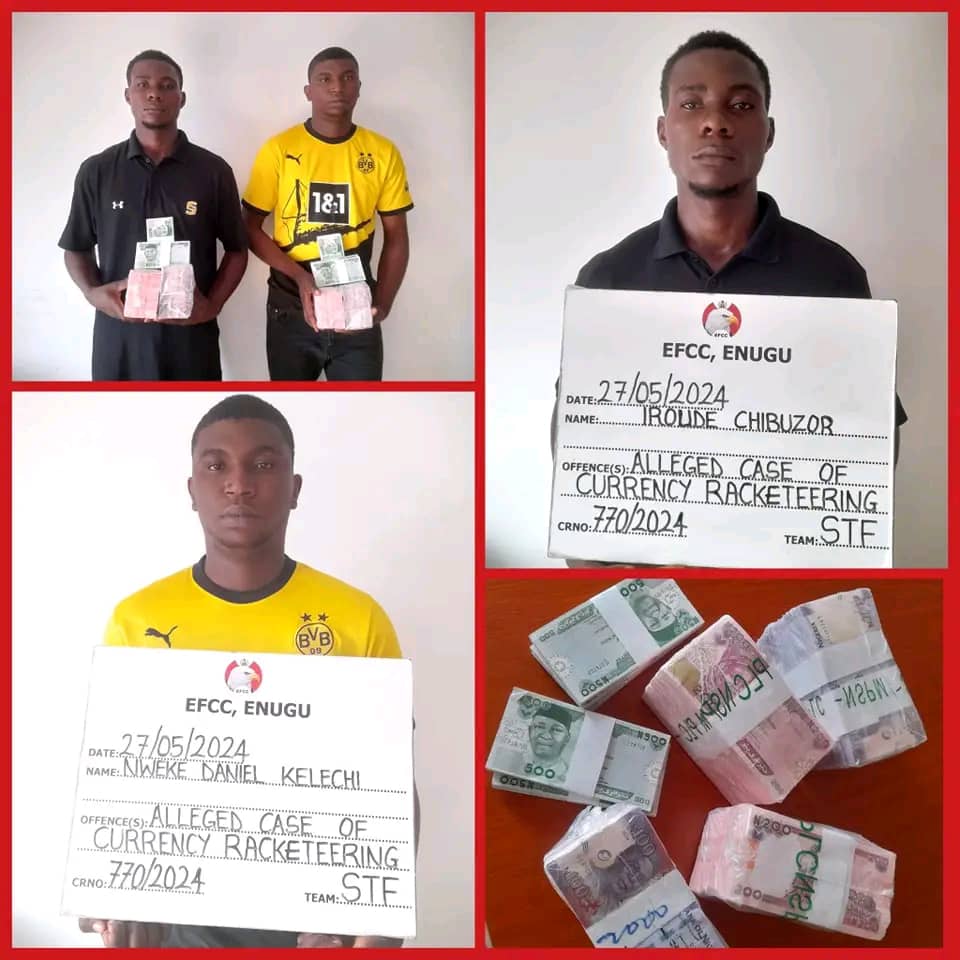 Operatives of the Enugu Zonal Command of the Economic and Financial Crimes Commission, EFCC have arrested the duo of Nweke Daniel Kelechi and Iroude Chibuzor in connection with alleged currency racketeering of N850, 000. 00 (Eight Hundred and Fifty Thousand Naira).