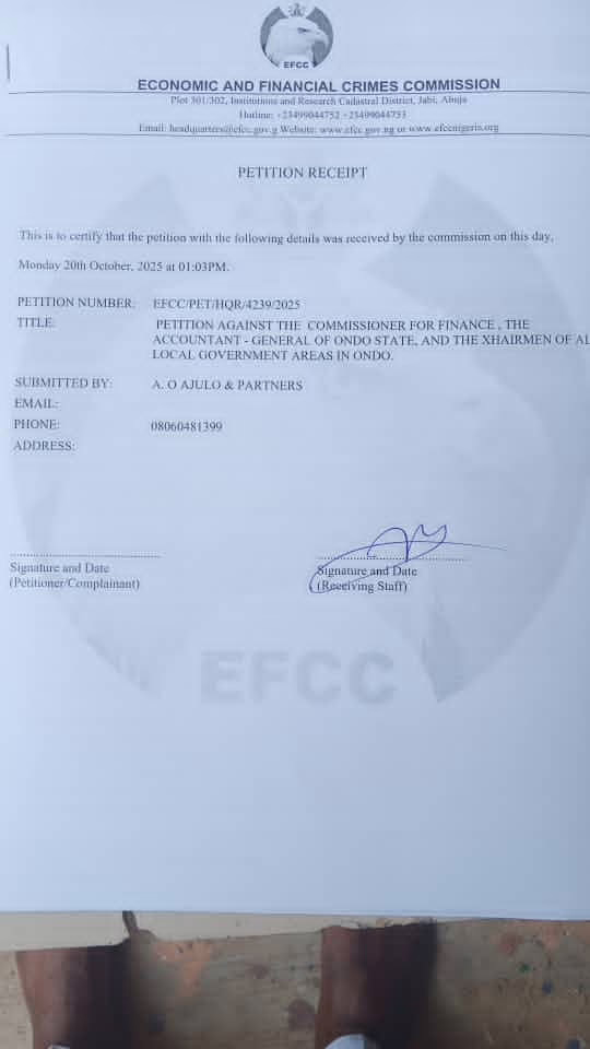 A civic organization, the Ondo Redemption Front (ORF), has petitioned the Economic and Financial Crimes Commission (EFCC) and the Independent Corrupt Practices and Other Related Offences Commission (ICPC), calling for a probe into alleged diversion and mismanagement of local government funds in Ondo State.