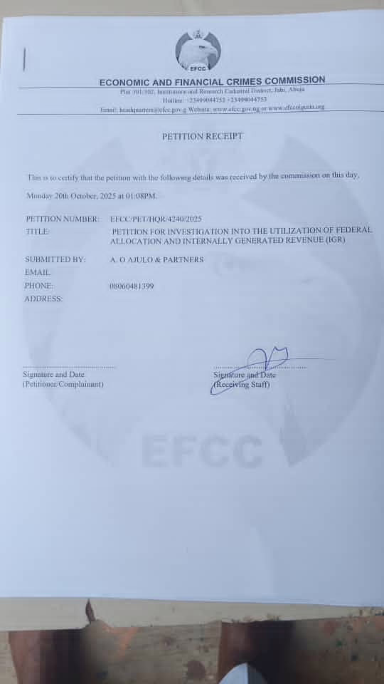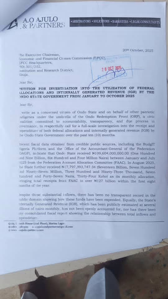 In a separate petition, the ORF also called for an investigation into the management of federal allocations and internally generated revenue (IGR) by the state government between January and August 2025.