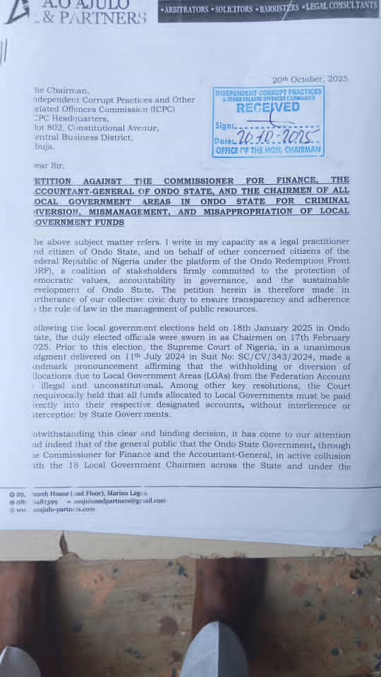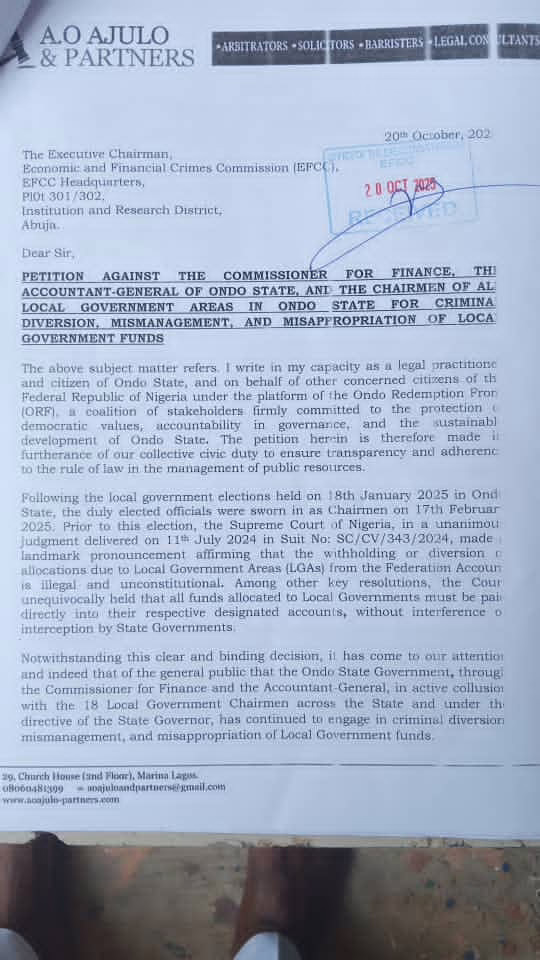 In the two separate petitions signed by A.O. Ajulo, Esq., Secretary of the group, the ORF accused the Ondo State Ministry of Finance and the Office of the Accountant-General of violating the Constitution and the July 2024 Supreme Court judgment which directed that allocations from the Federation Account be paid directly to local councils.